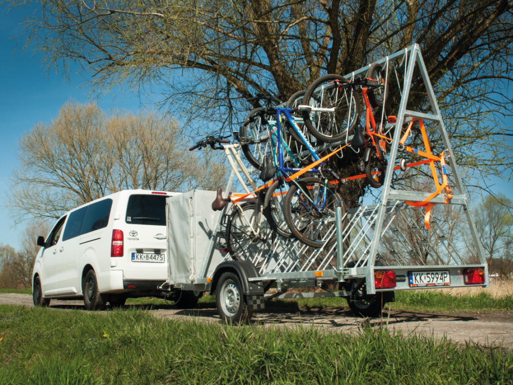 Idealne rozwiązanie dedykowane turystyce rowerowej. Nasza przyczepka może pomieścić 16 rowerów, w tym 2 zaczepy przeznaczone są dla rowerów elektrycznych. Nasza przyczepa rowerowa może być zapięta do każdego z naszych pojazdów, posiadających hak. Tym samym nasza oferta jest korzystna zarówno dla grup podczas wycieczek rowerowych organizowanych dla kilku jak i kilkunastu uczestników. Przyczepkę rowerową oferujemy również samodzielnie na wynajem. Zapraszamy do zapoznania się z naszą propozycją w zakładce oferta.